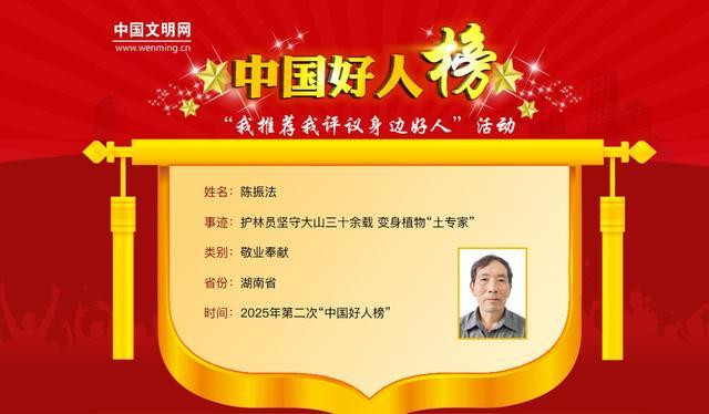 陈振法,男,1962年5月生,土家族,中共党员,湖南壶瓶山国家级自然保护区管理局巡护员。 1992年,30岁的陈振法加入壶瓶山保护区巡护员队伍,之后便坚守在有着“湖南第一哨”之称的湖南海拔最高的森林哨所——顶坪哨所。30多年来,他记录野生动物、植物、物候、人为活动等监测信息5000余条,发现湖南新纪录种3种,制作标本2000多份,巡山记录本达80本。陈振法曾获湖南省公益林保护建设优秀护林员、“湖南好人”等荣誉。 “00后”举重运动员刷新世界纪录勇夺奥运冠军