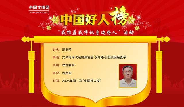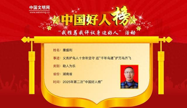 红网时刻新闻8月27日讯(记者陈沁贤)行善不一定惊天动地,一次搀扶、一句承诺、一份坚持,都是崇德向善的起点。8月27日,中央精神文明建设办公室发布2025年第二次“中国好人榜”,湖南9人光荣上榜,他们用行动诠释着道德的力量,用坚守书写着人性的光辉。 助人为乐“中国好人” 义务护鸟人十余年坚守巡“千年鸟道”护万鸟齐飞