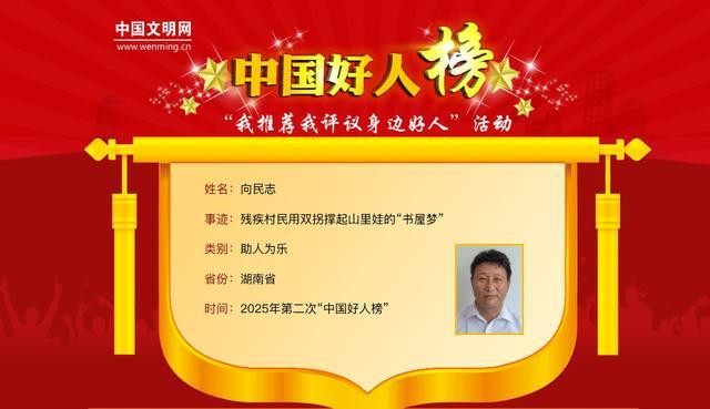 向民志,男,苗族,1970年6月生,湖南省湘西土家族苗族自治州泸溪县潭溪镇小陂流村四组村民。 向民志双脚先天性残疾,勉强依靠一双拐杖或使用两个矮凳行走。就是这样一位拄着双拐的农民,2016年起自筹资金,利用自家的空置宅基地,创办了湖南省首个农家书屋——明志书屋,为村里及周边的乡村儿童提供了阅读场所。多年来,书屋坚持免费开放,共服务儿童9400余人次。向民志曾获全国优秀农家书屋管理员、“全国十大读书人物”“湖南好人”等荣誉称号。 见义勇为“中国好人” 七旬党员临危不惧寒冬跃湖勇救男童