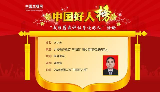 方小分,男,1971年12月生,中共党员,湖南省岳阳县筻口镇中心学校教师。 方小分的姐姐患先天性癫痫,哥哥有智力障碍且患淋巴癌,妻子因车祸致脑重伤,父亲患胃癌,母亲常年多病,面对家庭的重重困境,他没有退缩,而是勇挑重担,悉心守护家人。他曾多次放弃调往县城的机会,以无私的爱和顽强的毅力,始终坚守在家庭和教育的第一线,用行动诠释着责任与担当。方小分曾荣获“湖南好人”荣誉称号。 丈夫把家改造成康复室多年悉心照顾偏瘫妻子