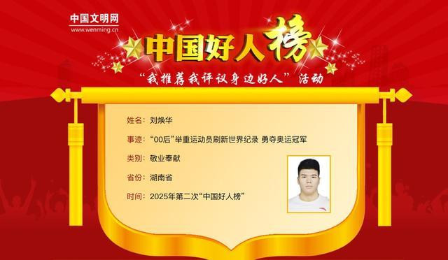 刘焕华,男,2001年8月生,湖南省郴州市嘉禾县晋屏镇人,中国男子举重队队员。 刘焕华凭借天赋和坚韧意志,从农村少年成长为举重冠军。他从嘉禾县第五中学举重队起步,历经天津队、国家队的磨砺,不断挑战自我,跨越多个级别比赛,最终在2024年巴黎奥运会为中国男子举重大级别项目实现突破,赢得中国代表团在巴黎奥运会的第34枚金牌。刘焕华曾获全国五一劳动奖章、“湖南好人”等荣誉。 乡村教师在“云端花瑶”为乡里娃放飞梦想
