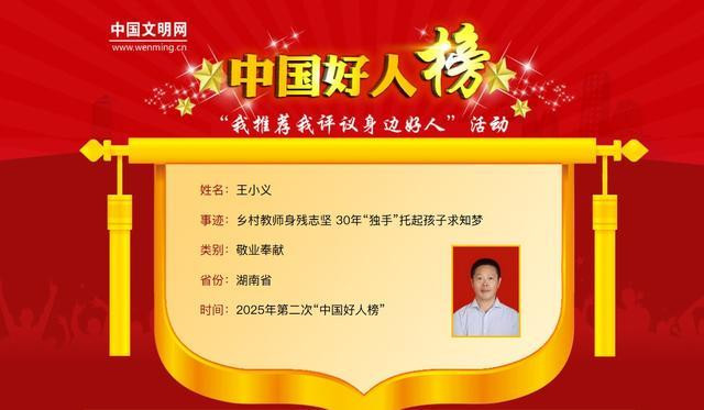 王小义,男,1976年10月生,中共党员,湖南省娄底市双峰县锁石中心学校育贤小学校长。 王小义自幼身患残疾,但他扎根乡村教育30年,先后在4所偏远村级小学教书,用自己的坚持和爱心,帮助600多名学生走出大山,他还激励更多人投身乡村教育,为乡村孩子点亮求知路。王小义曾获全国优秀教师、湖南最可爱的乡村教师、“湖南好人”等荣誉。 孝老爱亲“中国好人” 乡村教师挑起“千钧担”精心照料5位患病亲人